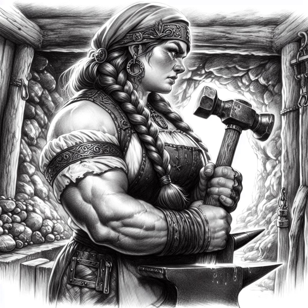 Damara ist eine Erzzwergin, wie der normale Mensch sich diese vorstellt: Muskulöse Arme, kräftig gebaut wie ein gutes Bierfass, dazu zwei lange, kunstfertig geflochtene Zöpfe.